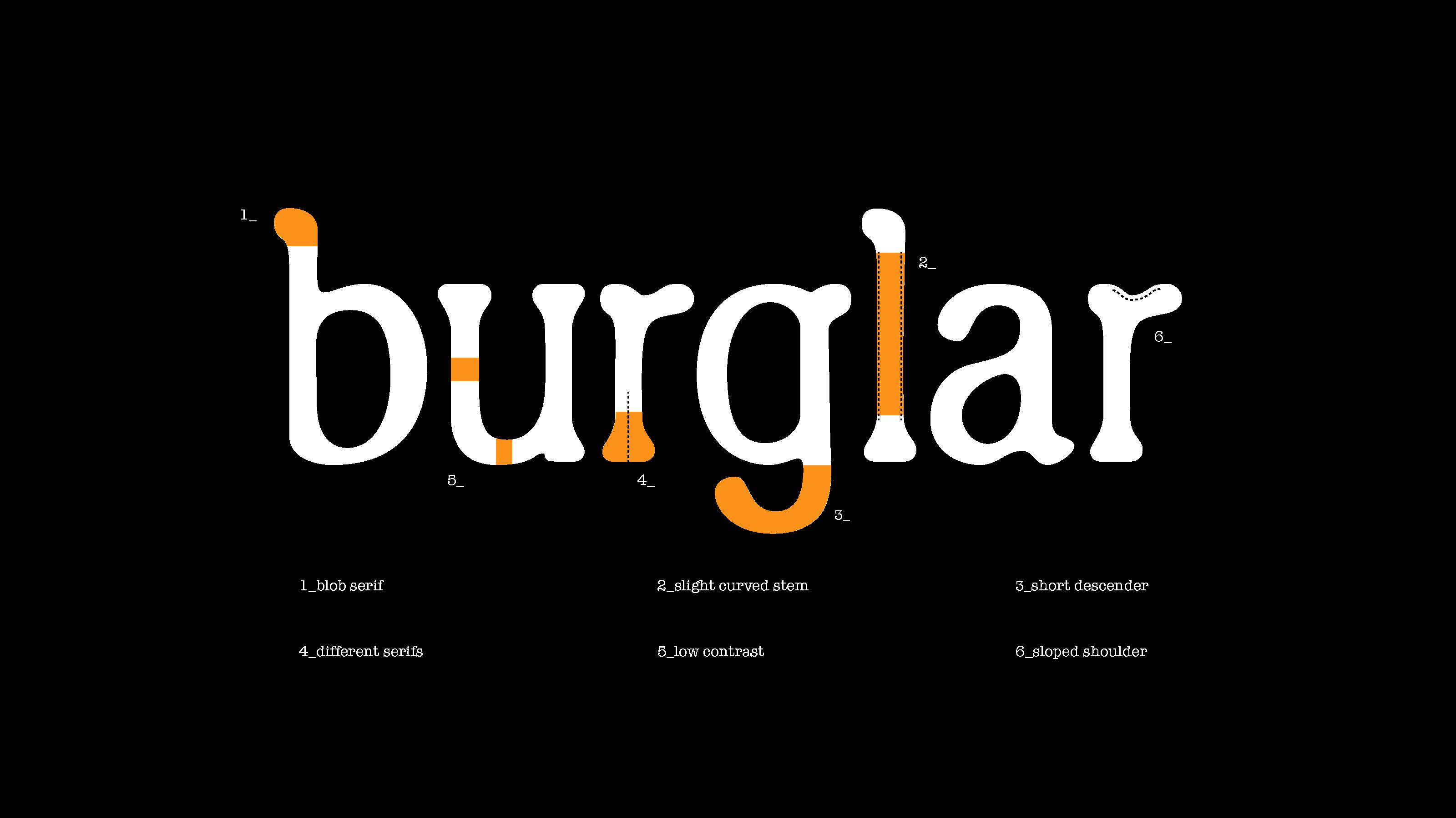 Burglar is a lowercase font that features blob serifs, curved stems, short descenders, and low contrast.