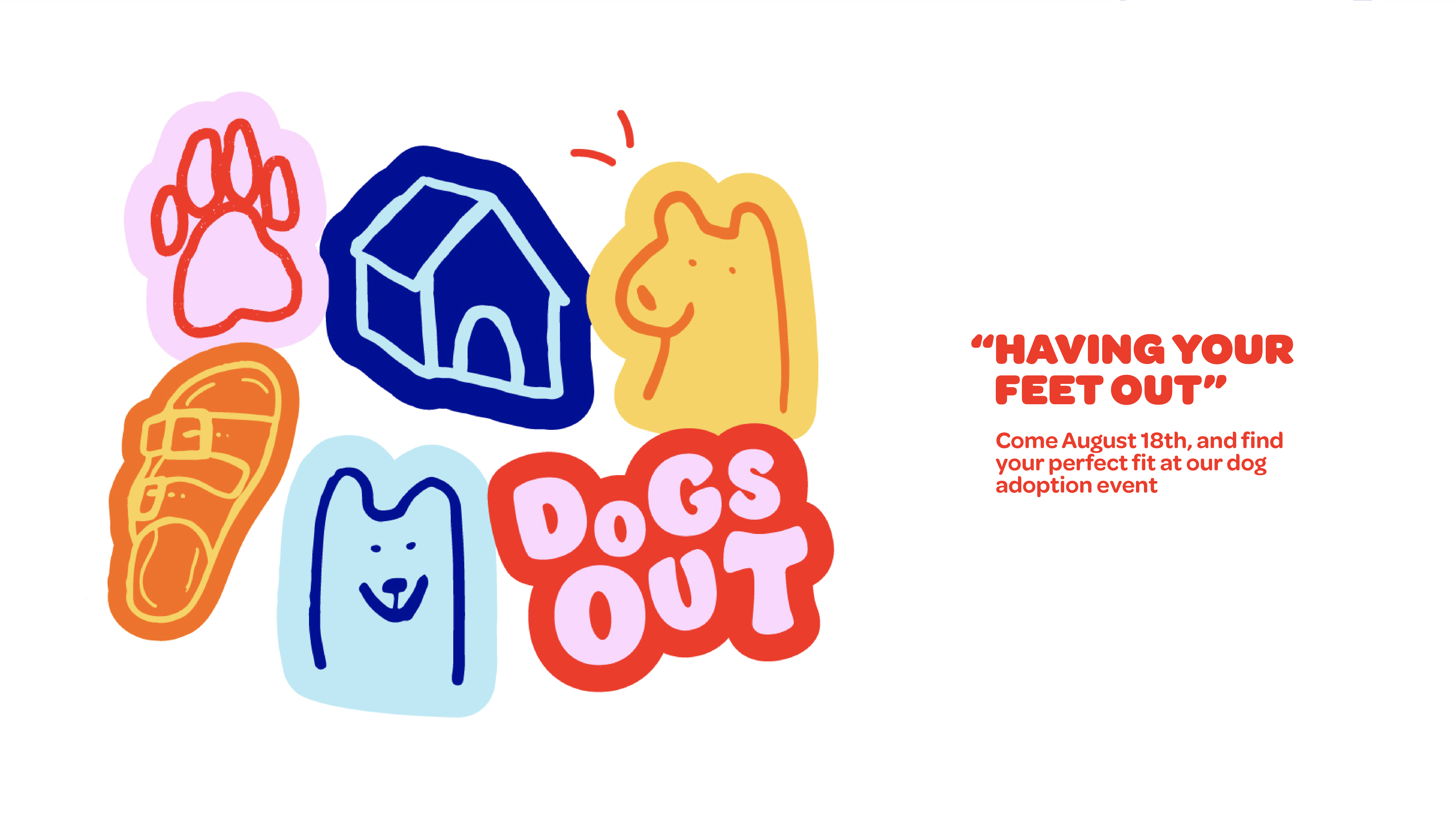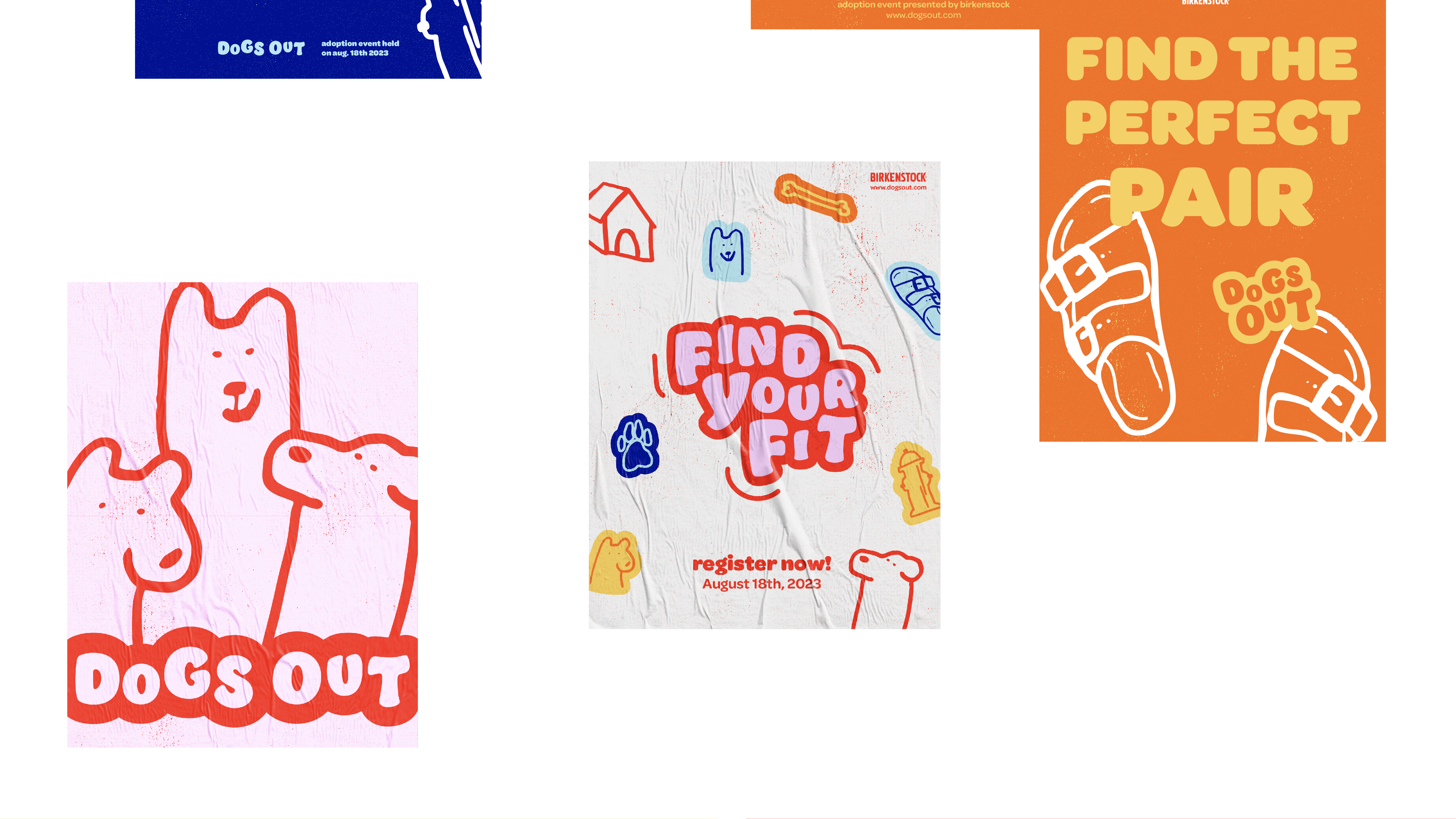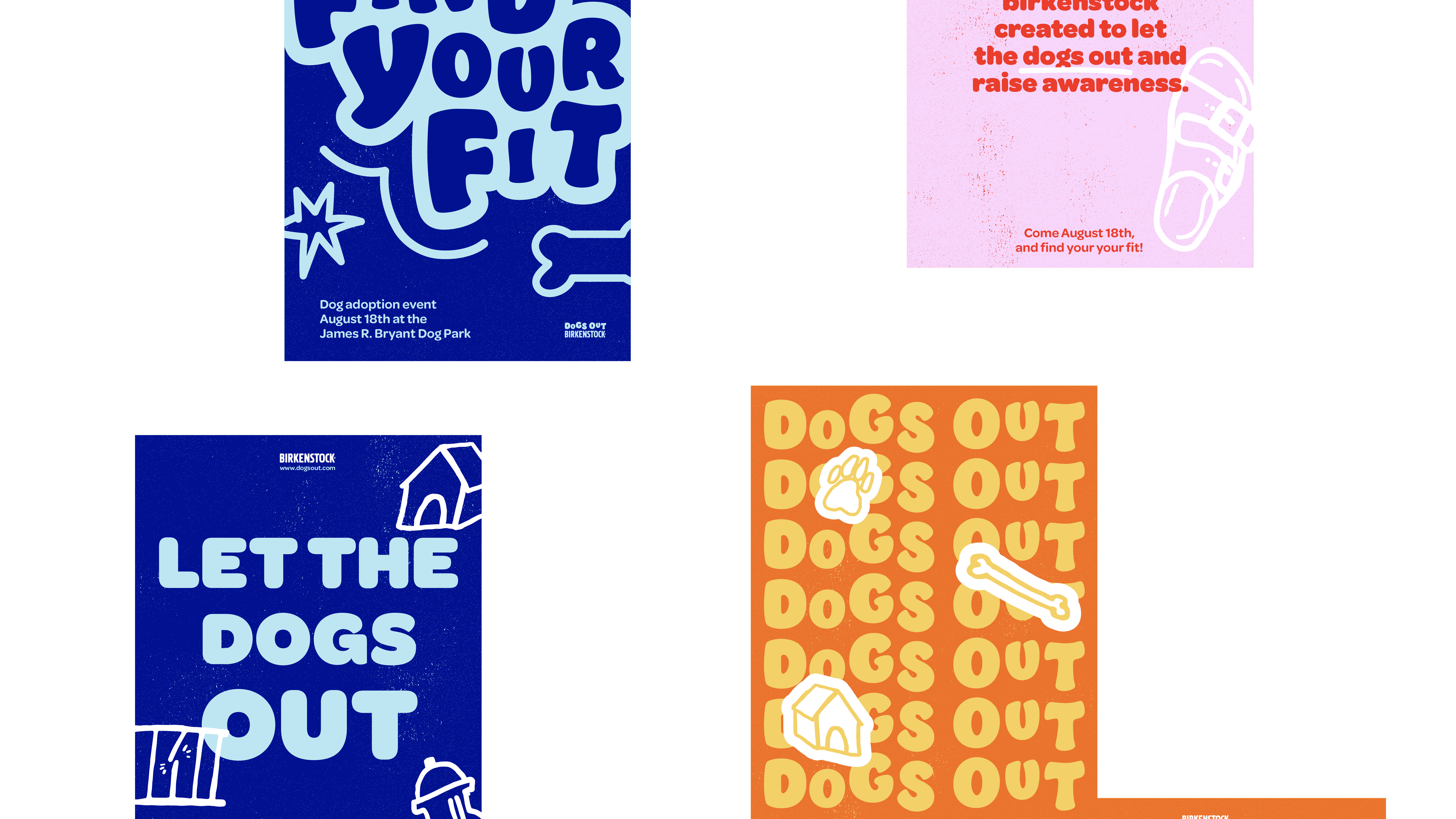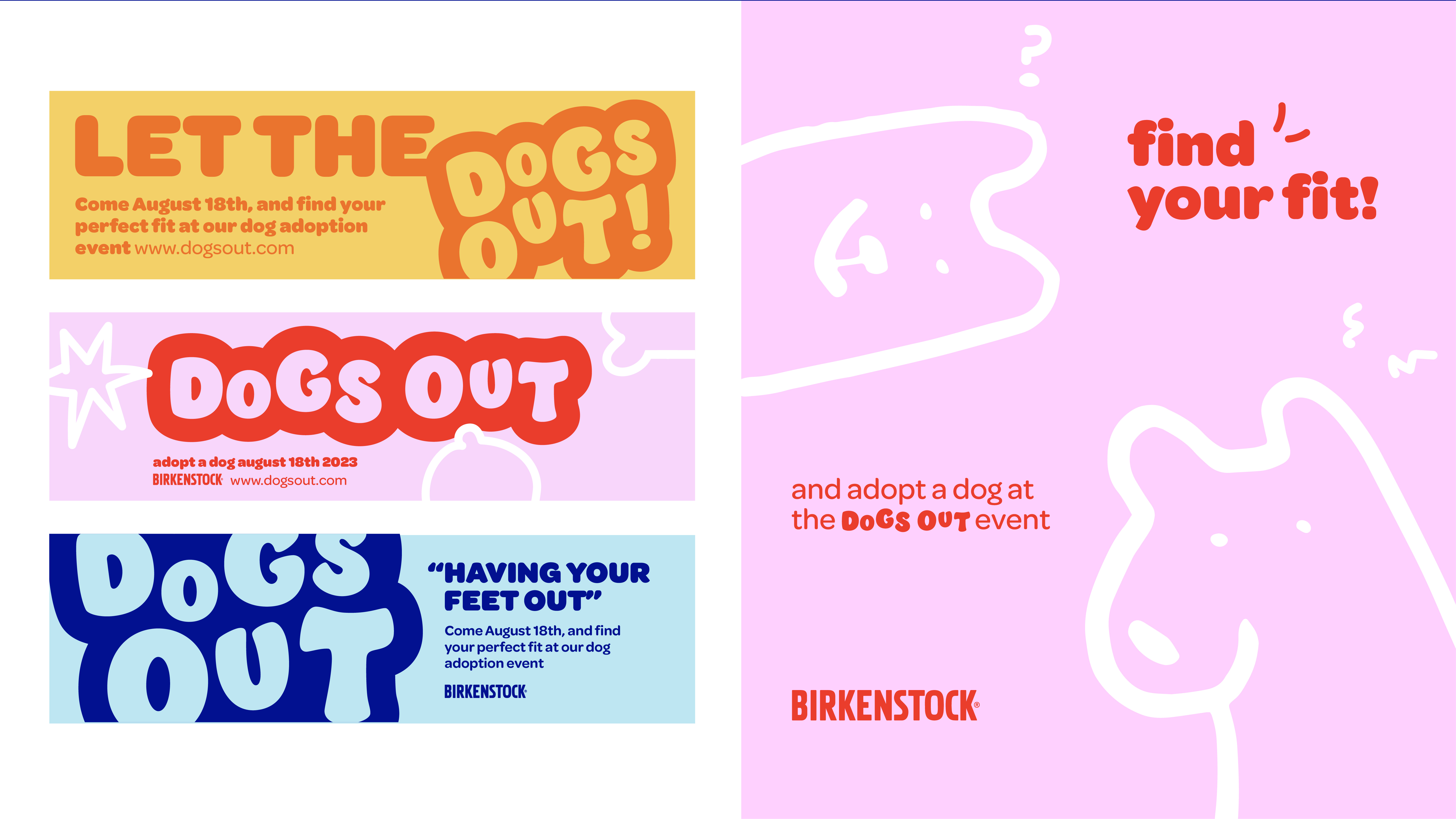 The Dogs Out campaign is a dog adoption event held by Birkenstock. The play on dogs out refers to one's feet being out. The dog characters and other icons act as mascots for this event, bringing out the energy and fun-loving nature of the company.