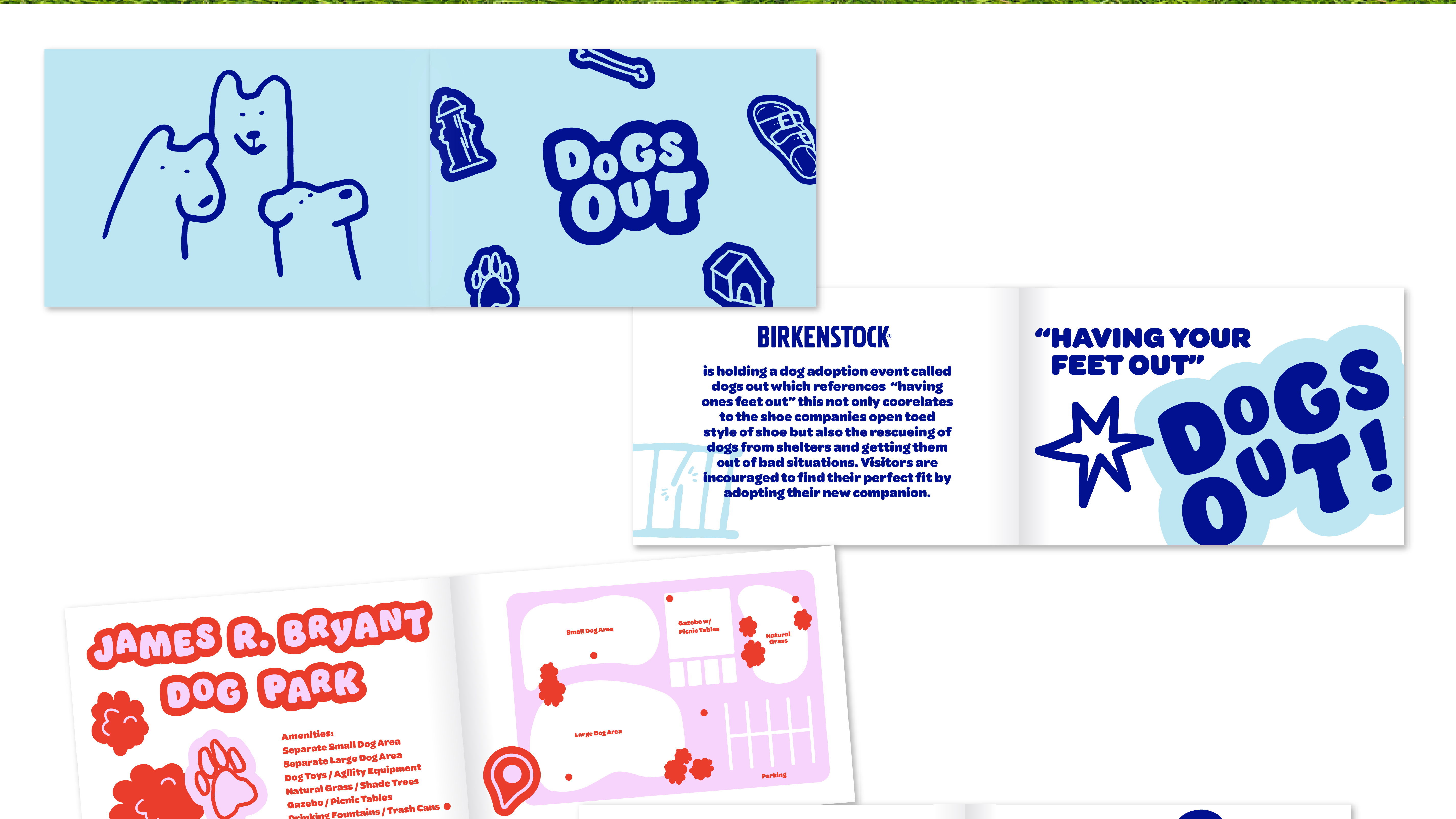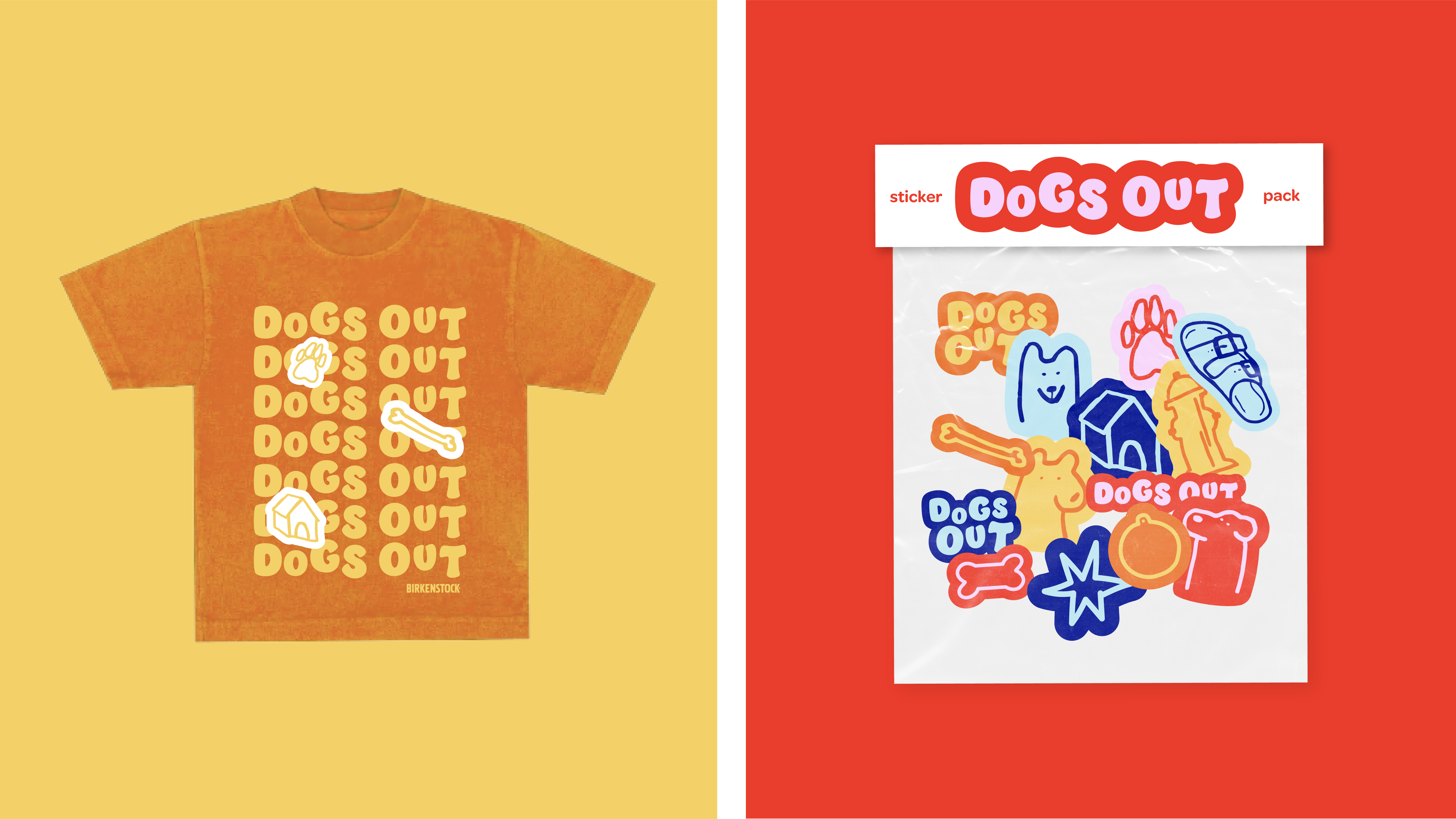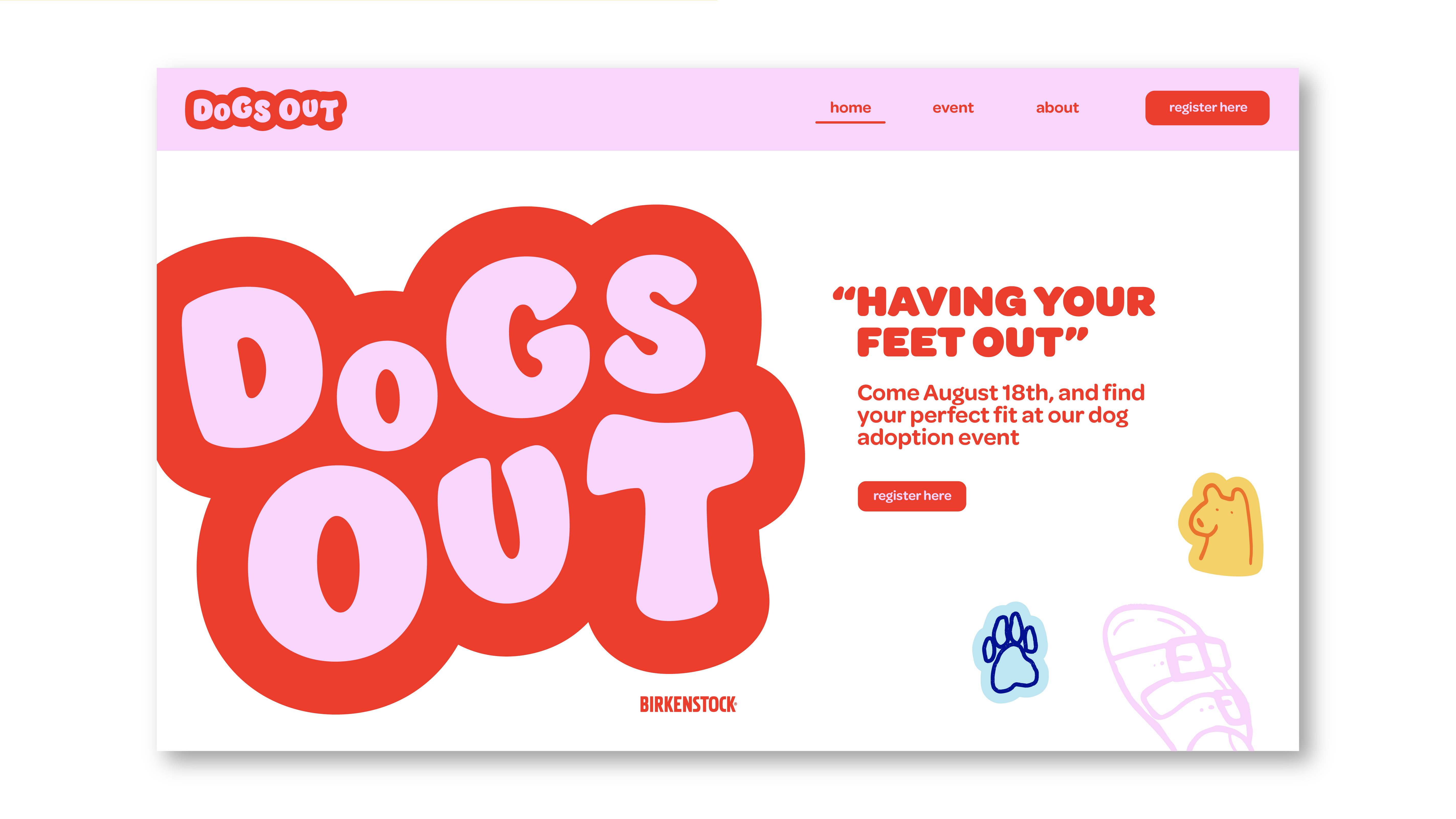 The Dogs Out campaign is a dog adoption event held by Birkenstock. The play on dogs out refers to one's feet being out. The dog characters and other icons act as mascots for this event, bringing out the energy and fun-loving nature of the company.